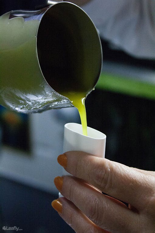 After all hard waxes have been melted down and the temperature remains consistent, it’s time for the fun part: adding in active cannabis and hemp seed oils. To make Ink 20/20, Warner does not infuse cannabis directly into the balm. Rather, she uses a pre-made mixture of infused cannabis oils.