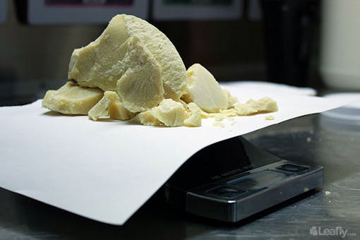 Next come the softer waxes. This photo features cocoa butter, added once the bee’s wax is completely melted to enhance moisture and provide healing skin with ample antioxidants. Warner also adds in a third type of fat, shea butter, to give the balm the proper consistency and boost its anti-inflammatory capabilities.