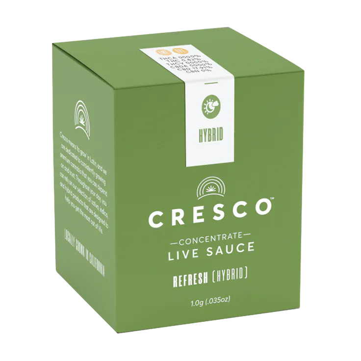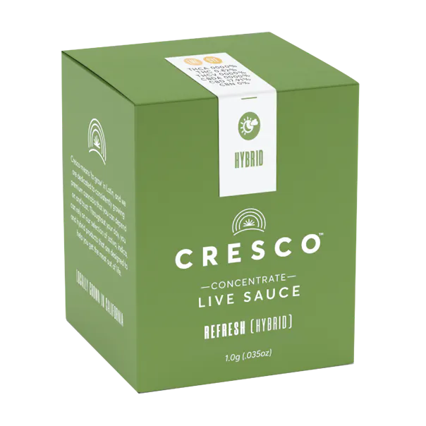 Cresco Refresh Live Resin Sauce is available in 500mg, 1g, and 2g. A jelly-like consistency comprised of both a syrupy liquid and granular crystals. Derived from fresh frozen cannabis to ensure maximum cannabinoid and terpene retention, our suite of live concentrates is aromatic and potent.