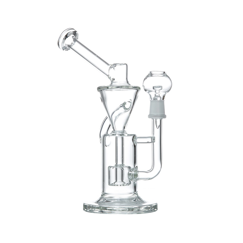 This Barrel Perc Vortex Recycler has a unique design and incredible performance. Look wiithin the main chamber of this recycler rig, and you'll find that it contains a barrel perc that provides amazing filtration and diffusion. As you are inhaling through the Vortex Recycler, Rig, the vapor travels from the male joint and into the barrel percolator. Smoke and water are then guided through the separation tubes, and into the recycling chamber tapered recycling chamber. The water and the vapor are caught in a cycle, moving between the two chambers and recycling water through the barrel perc multiple times. The angled mouthpiece also prevents any water from exiting the rig and touching your lips. The best part about this rig is the visual effect. When you stop inhaling through the mouthpiece, the water spirals down the recycling chamber to create an awesome vortex. Want to see this piece in action? Visit our website, where nearly every product page has a demonstration video.