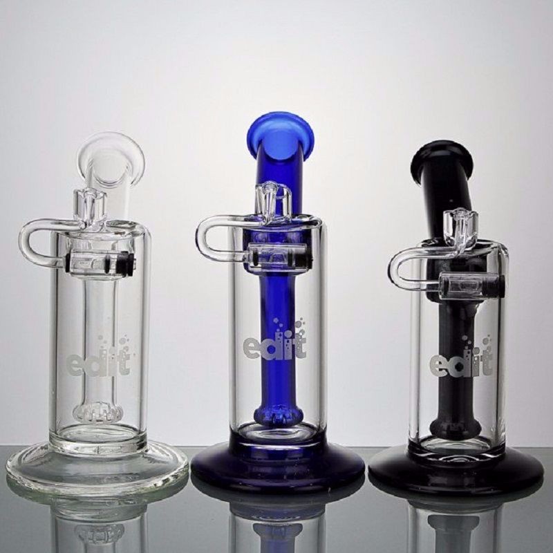 This portable clear glass showerhead diffuser bubbler from the EDIT Collection is available in a variety of colored accents. This sturdy glass dab rig comes equipped with an effective showerhead diffuser, sidecar mouthpiece, and quartz swing banger.