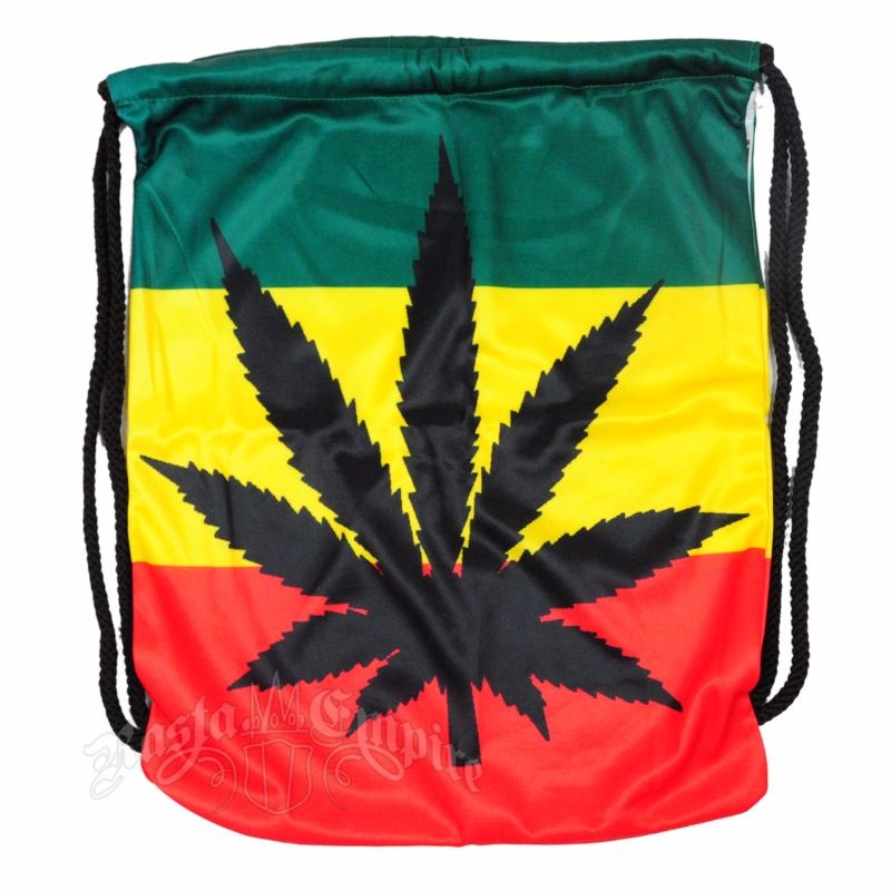 This cinch bag features Rasta colors with a big marijuana leaf in black. Approx. 14-1/2" X 18" inches. 100% cotton.