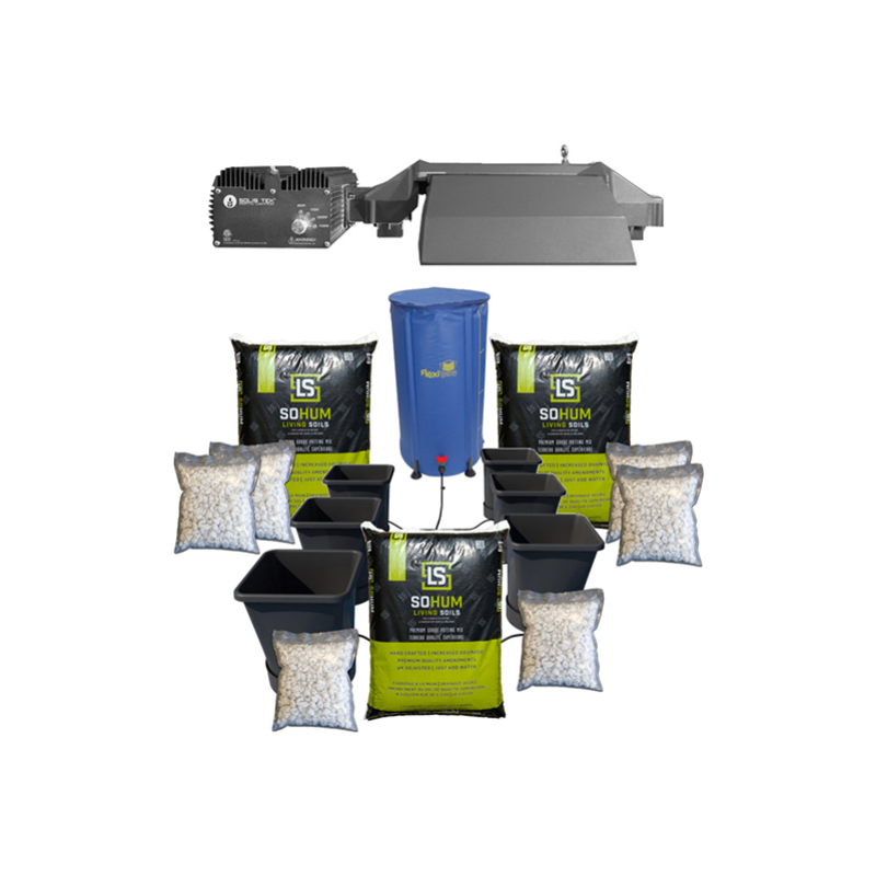 Everything you need to start your all natural indoor cultivation. Enjoy our perfected growing recipe through your plant’s complete life-cycle without the time consuming guesswork of nutrient mixing. Just add water. This kit is our biggest seller and an incredible value during our summer pricing. Let’s grow together! This Kit Includes: (1) 25 gallon Flexitank, (6) 6.6 gallon pots, (3) 1.5 ft³ SoHum Soil, (6) 5 oz perlite bags, (1) 1000W Solis Tek light, (1) Best Practices and Getting Started guide.