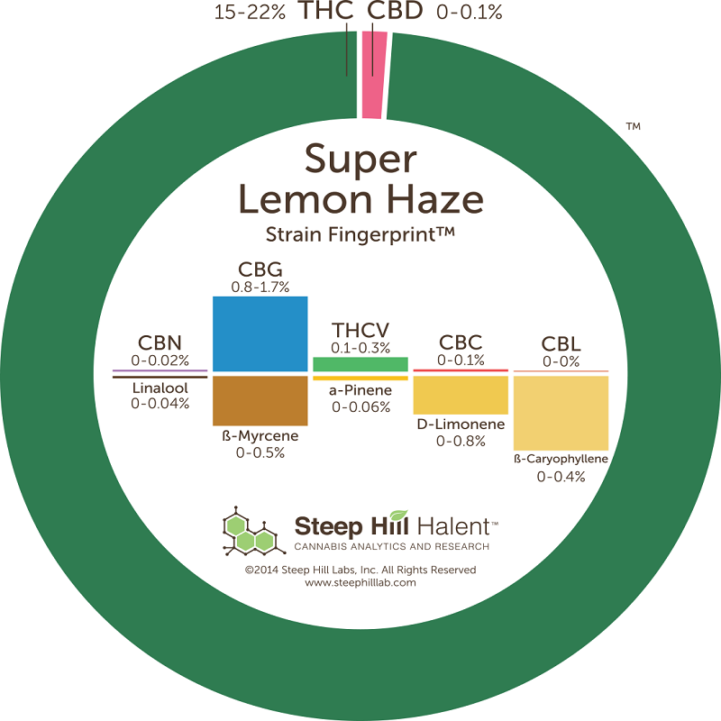 Steep Hill has developed a dynamic identification system to qualify cannabis varieties. Our Strain Fingerprint (TM) shows the average concentrations of twelve of the most relevant cannabinoids and terpenoids found in cannabis strains.