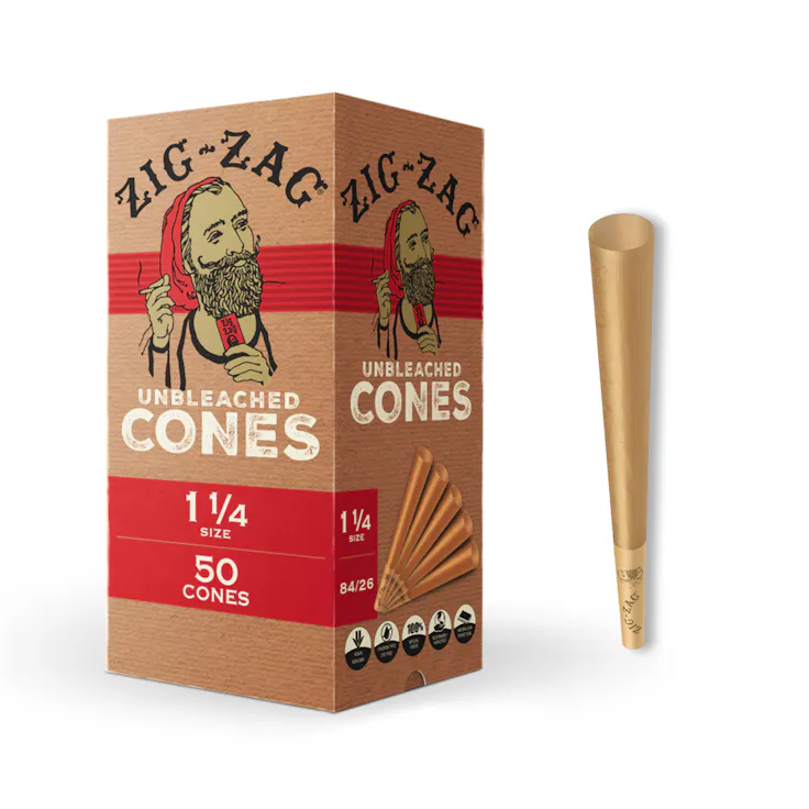 Zig-Zag Unbleached Cones are ultra thin crafted using a blend of natural fibers without the addition of any ingredients or processing. Recycled cardstock booklet with vegetable ink printing.