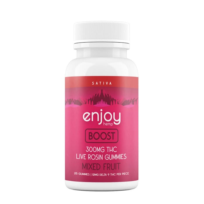 Feeling: ✓ Revitalizing, Hydrating & Invigorating Dosage: ✓ 12mg per gummy | 300mg per bottle Flavor: ✓ Mixed Fruit Potency: ✓ High Experience the perfect balance of potency and flavor with Enjoy Hemp's Delta 9 THC gummies, infused with premium live rosin for an exceptional cannabis experience. Key Features: 12 mg of Delta 9 THC + Terpenes Per Gummy