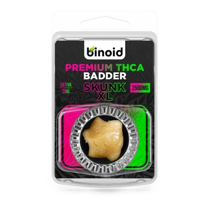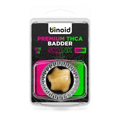 Skunk XL from Binoid is a bold Sativa THCA Badder known for its sharp, skunky aroma and energizing effects. Crafted from fresh-frozen flower and infused with strain-specific live terpenes, this badder delivers a clean, flavorful dab with a whipped, creamy texture that melts effortlessly.