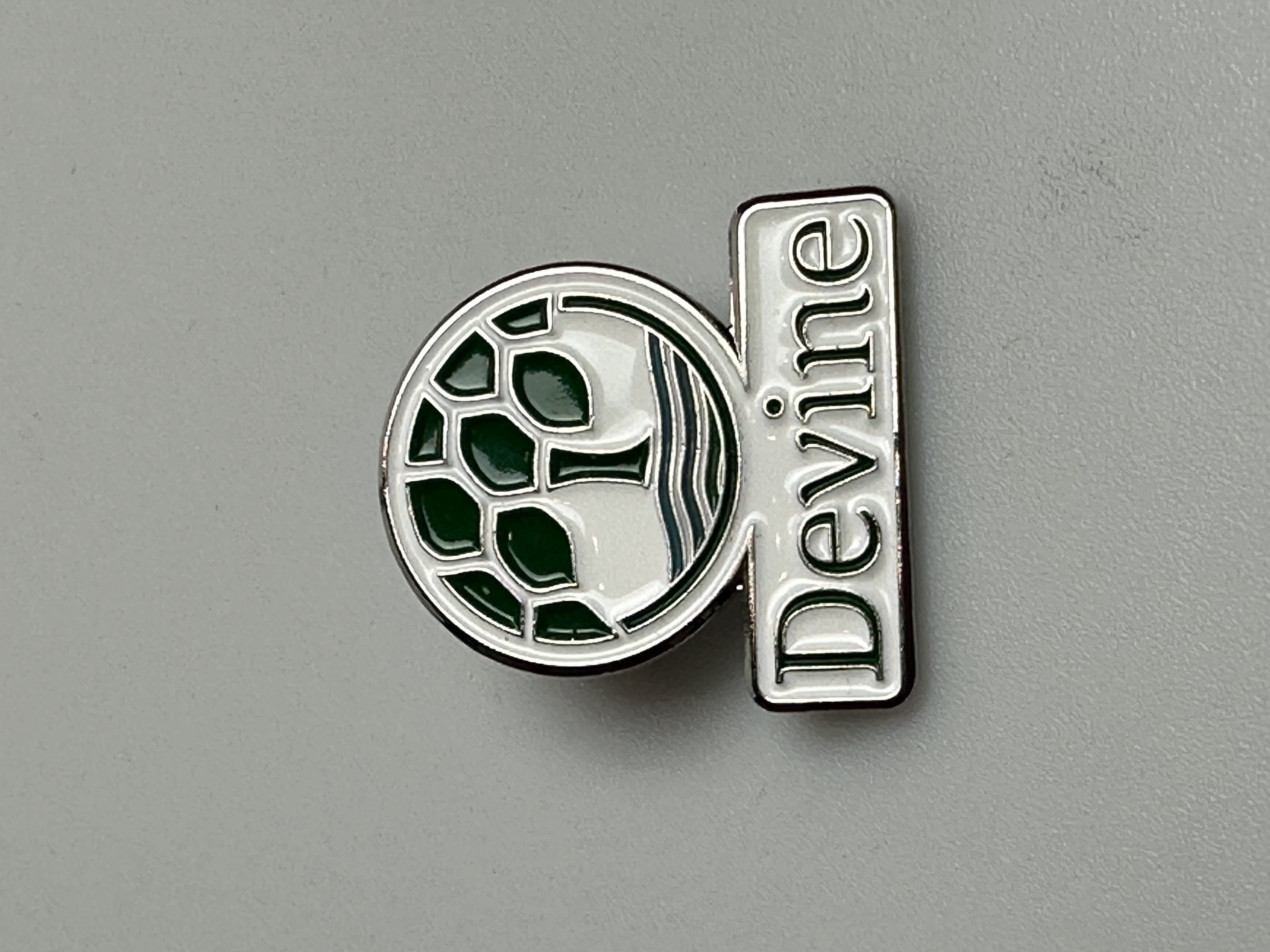 Our very own Devine Pin. Features our circle tree logo accompanied with our brand name in a stylish green on white color combination.