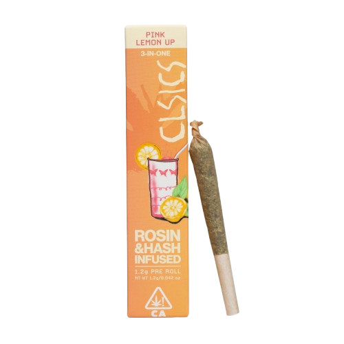 CLSICS' Trifecta Hash Infused Preroll in Pink Lemon Up is a premium 1.2g joint that combines three forms of cannabis: top-tier flower, solventless ice water hash, and live rosin. This infusion method preserves the plant's full spectrum of cannabinoids and terpenes for a rich and potent smoking experience. CLSICS is known for its dedication to solventless extracts and terpene-forward products, and this preroll reflects that philosophy.
