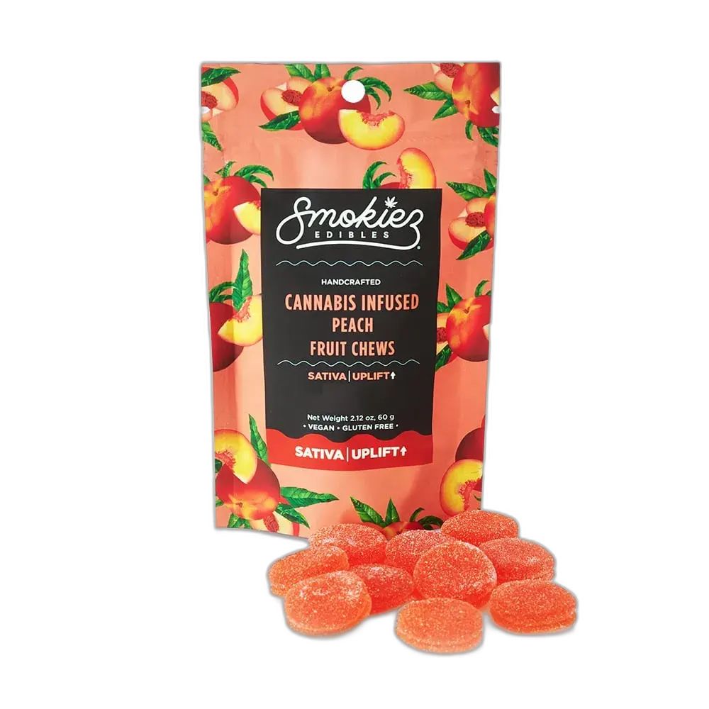 Enhanced with real cannabis terpenes!\nSmokiez Peach Sativa Fruit Chews are NOT YOUR AVERAGE FRUIT CHEWS™ ;)\nThese fruit chews taste like fresh peaches picked right off the tree, with a balance of sweetness and fruity notes.\nThese delicious fruit chews are a tasty and discreet way for you to medicate!\nThey are also Vegan, Gluten Free, Dairy-Free, and contain NO High Fructose Corn Syrup.\nEach of our mouth watering fruit chews contain 10 mg of THC, and made with our high clarity cannabis distillate for great taste.\nThere are 10 pieces per package with 100 mg active THC per package.