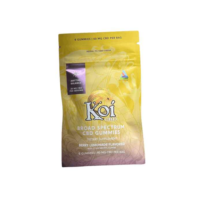 Come back to the center and find your sense of balance. Made with 20 mg of Koi PRIZM™ Broad Spectrum CBD per serving (2 gummies), these sweet Berry Lemonade flavor gummies deliver a great-tasting wellness experience. Designed for everyday wellness support, Koi Anytime Balance broad spectrum CBD gummies are an easy (and vegan) way to get your daily serving of balancing CBD. Koi broad spectrum CBD gummies are consistently blended for even cannabinoid distribution. Each batch is third-party tested for compliance, purity, and consistency.
