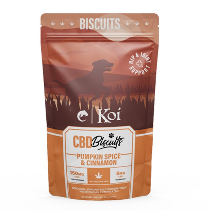 Help maintain hip and joint wellness in your pup. Koi Pumpkin Spice & Cinnamon Joint Support CBD Dog Biscuits combine our Koi CBD full-spectrum hemp extract with natural ingredients like pumpkin, cinnamon, and Turmeric root, used for centuries for their anti-inflammatory properties. Together, this veterinarian-formulated blend gives your furry friend the mobility support they need. Joint support CBD biscuits from Koi are made free of gluten, dairy, and GMOs so that you can be confident knowing you’re giving your dog only the best.