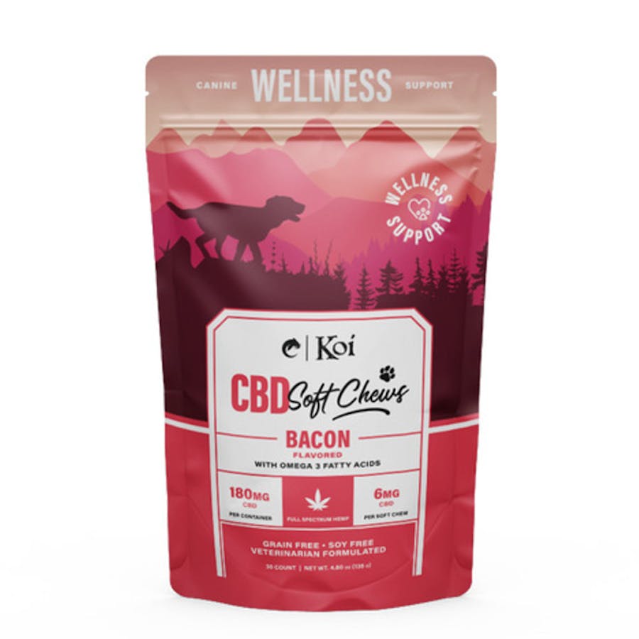 A balanced and healthy dog is a happy dog. Koi Omega Hemp CBD Soft Chews deliciously deliver naturally occurring CBD with nourishing omega-3, omega-6, and omega-9 fatty acids to complement everyday wellness, encourage physical comfort, and promote a sense of calm. These all-natural CBD soft chews are sourced from USDA organic full-spectrum hemp, providing the plant's wholesome benefits. All this goodness comes in a tender chew with a crave-able bacon flavor that will make your pup flip. Every batch of Koi Omega Hemp CBD Soft Chews is third-party tested for purity and potency.