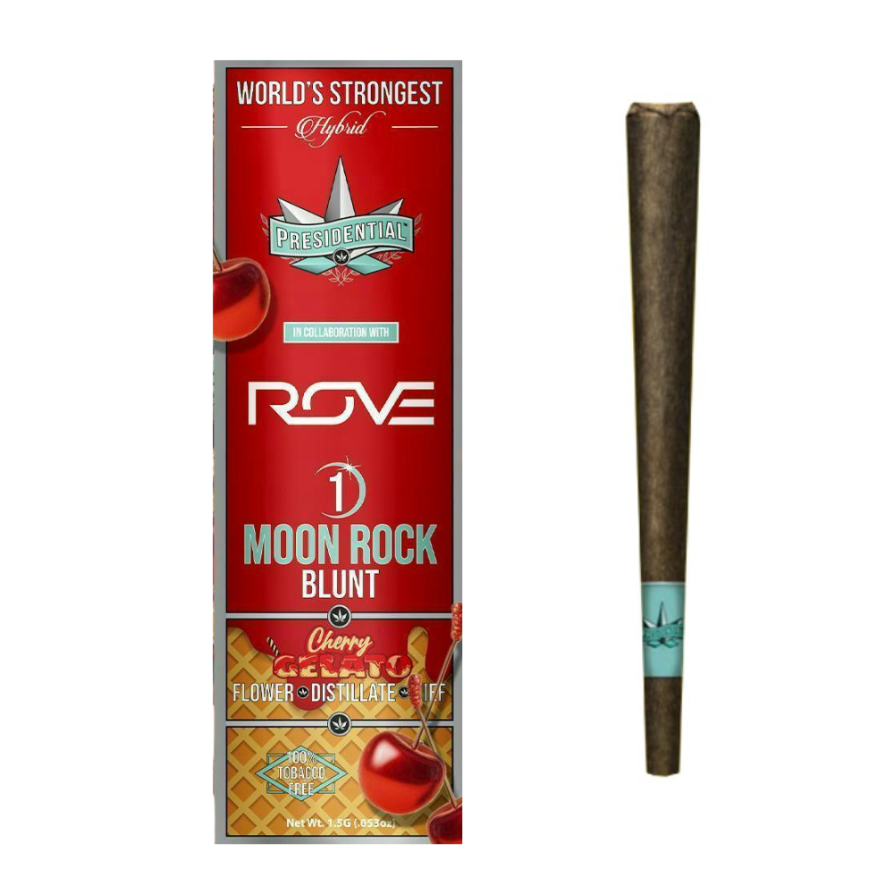 Product Description This 1.5g Cherry Gelato Presidential Moon Rock Blunt by Presidential THC is filled with indoor craft cannabis and rolled in a 100% tobacco free wrap. The cannabis is then INFUSED with premium Liquid Live Resin, using Presidential’s proprietary infusion process that enables us to permeate the flower to the stem. Finally, it is coated in the highest quality Diamonds, creating the slowest burning, most potent Moon Rocks on the market! Strain Lineage Black Cherry Funk x Acai Possible Effects Euphoric, relaxed, and creatively stimulating—ideal for afternoon or evening use. Flavor Notes & Aromas Sweet combinations of tropical berries for a fruity, indulgent smoke.