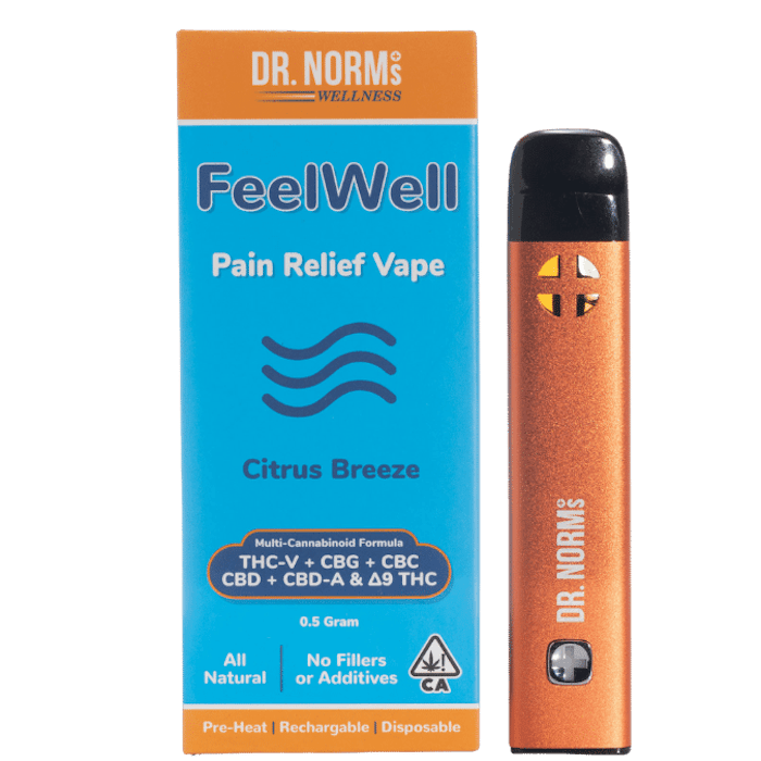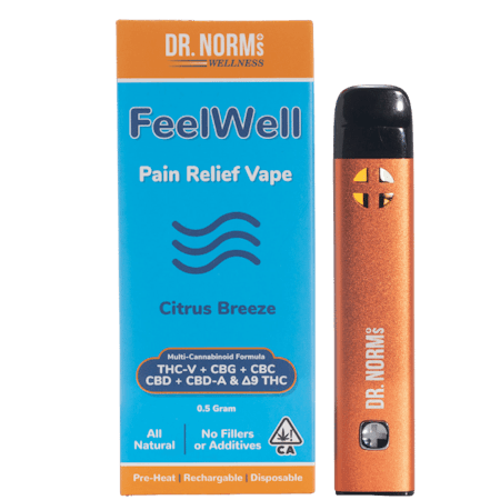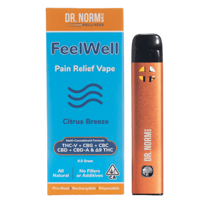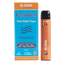 FeelWell Pain Relief Vape by Dr. Norm's Wellness delivers a potent and fast-acting solution for managing pain and reducing stress. Designed with a precise blend of six isolated cannabinoids, this vape offers a unique and effective approach to pain relief. The refreshing Citrus Breeze flavor combines lemon, lime, and other citrus terpenes for a delightful vaping experience. Utilizing advanced nano technology, FeelWell Pain Relief Vape ensures rapid onset of effects, providing relief exactly when you need it.