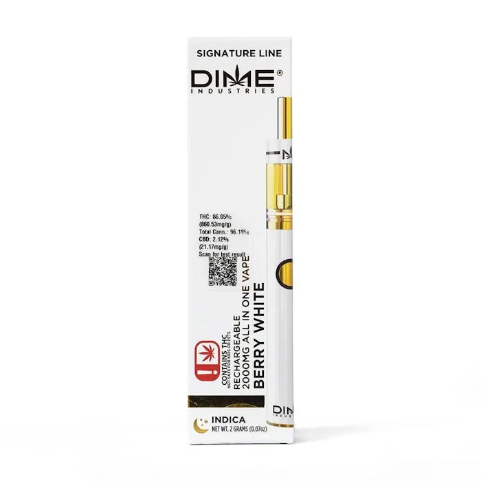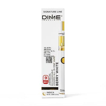 Dime Signature Line All In One Indica Disposable Vape 2g – Unwind with Elevated Ease Discover the ultimate in calm and comfort with the Dime Signature Line All In One Indica Disposable Vape 2g. Designed for those who seek deep relaxation and flavorful indulgence, this premium vape blends potent effects with modern convenience in a sleek, rechargeable device. Each 2g disposable is a showcase of Dime’s commitment to excellence, crafted with a proprietary formulation of strain specific live resin, natural botanical terpenes, and ultra pure, solvent free cannabis distillate. With total cannabinoid levels ranging from 80% to 95%, the Indica line offers a luxurious and effective experience that goes far beyond the ordinary. Crafted for Tranquility, Engineered for Reliability The Dime All In One Indica vape features next gen hardware designed for consistent performance and seamless use. With dual ceramic heating plates, you’ll enjoy even vaporization and smooth hits that retain terpene richness without the harsh burn. The smart chip technology regulates heat levels for optimal flavor preservation, while the zero waste atomizer ensures every drop of oil is enjoyed. An integrated USB-C port provides rapid charging, making this device the perfect travel companion. With five customizable heat settings, you can tailor each session to your comfort—whether it’s a quiet evening or a restful night ahead. A harmonious fusion of Blueberry and White Widow, Berry White delivers crisp berry notes with undertones of mint and pine. Known for its uplifting euphoria and appetite stimulating effects, this strain is a go to for mellow conversations or evening unwinding