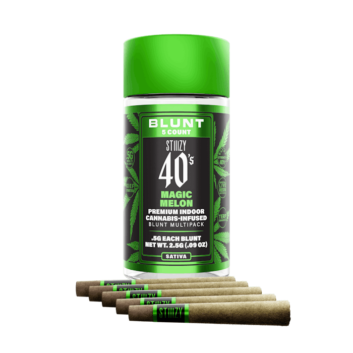 Total Cannabinoids: 43.86% 5 pack of 0.5g Blunts. (Total of 2.5g) Rolled in 100% tobacco-free hemp and finished with kief, Magic Melon infused blunts showcase smooth, even performance and the balanced consistency that defines the 40’s experience. Offered in 2.5G five-packs, these blunts are crafted for quality, presentation, and consistency in every draw. STIIIZY is known as an innovative, award-winning, California-based cannabis brand. Founded in 2017 as a pioneering vape company, STIIIZY evolved into so much more. Today, STIIIZY has become one of the world's most treasured cannabis brands with its class defining retail stores and amazing cannabis products Always innovating, always inspiring, always influencing: that's us. Let's take it to new heights. #STAYSTIIIZY **NO DELIVERY FEES** **PAY WITH CASH, DEBIT CARD OR CONNECT A BANK ACCOUNT** **Your order contributes to providing donations through Sweetleaf Collective to low-income patients and veterans experiencing cancer, HIV, terminal illness, and PTSD.** **Effects & flavors are reported by users on our site. This is for informational purposes only and not intended as medical advice. Please consult your physician before changing any medical treatment.**