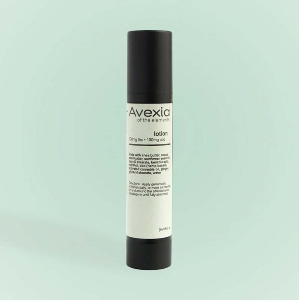 Equal parts of CBD & THC come together to create a hydrating lotion. Avexia blends an all-natural blend of olive oil, cacao butter, and vitamin E, along with a sensual blast of ginger and rosemary. -- 100mg THC/100mg CBD