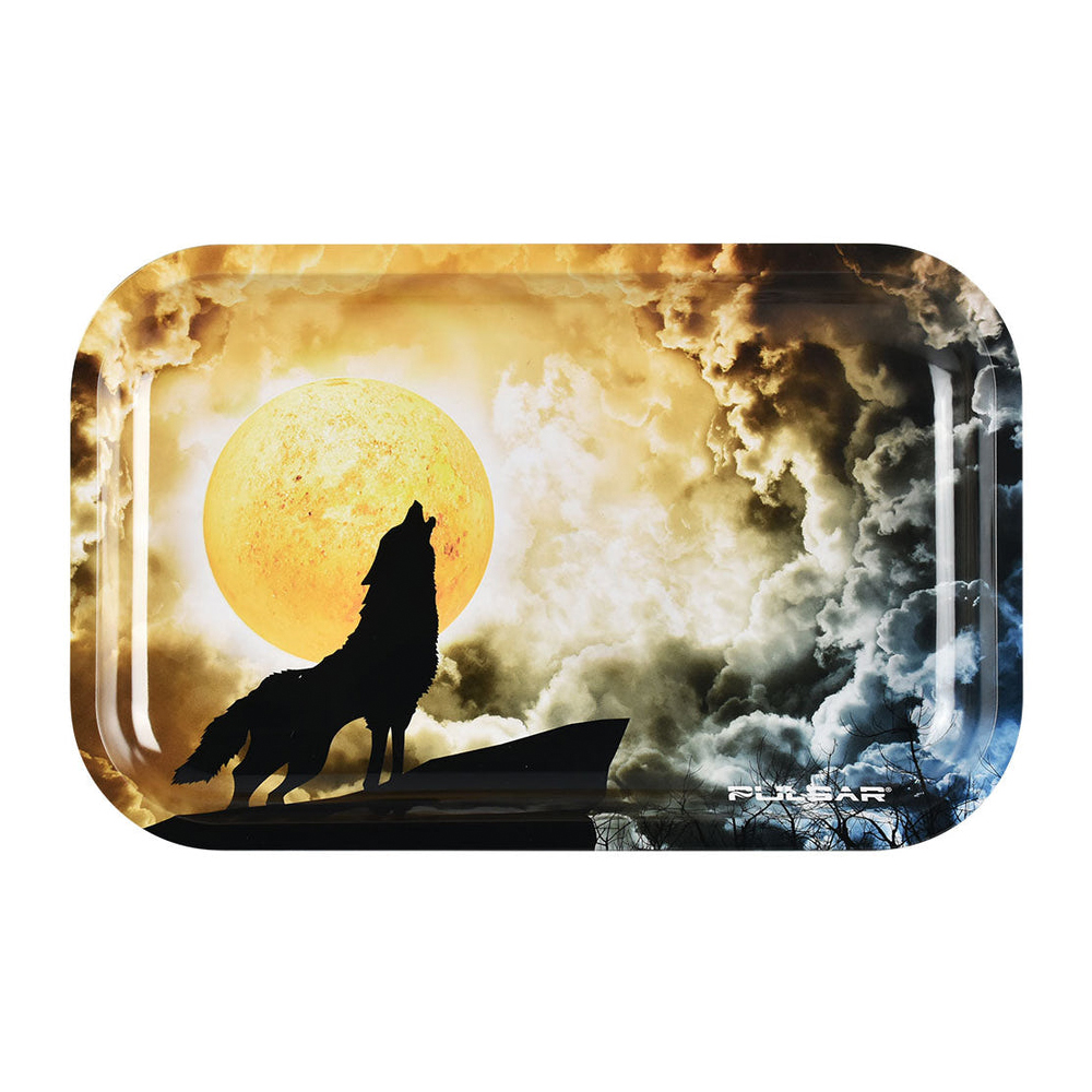 The Howl at the Clouds design pictures a wolf howling in front of a full moon, making this glow in the dark design perfect for the lone wolf or a pack of friends to share. -- The Pulsar Metal Rolling Tray is made from a lightweight metal and has raised sides with smooth, rolled edges to keep all materials and tools contained. The matching Rolling Tray Lid fits securely on top of the tray, magnetically attaching to the edges for storing all contents when not in use. The colorfast art is resistant to fading, peeling, or chipping, which means these are built to last. Sold individually or as a matching set!