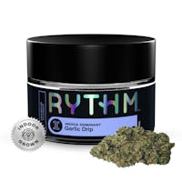 Rythm | Garlic Drip | Premium Flower | Indica | 3.5g"[orig. GMO x White OG] is a resin laden hybrid strain with sandy trichomes.RYTHM Premium Flower offers a variety of expertly cultivated and meticulously cured strains with optimal potencies, lush aromas, and rich flavors."