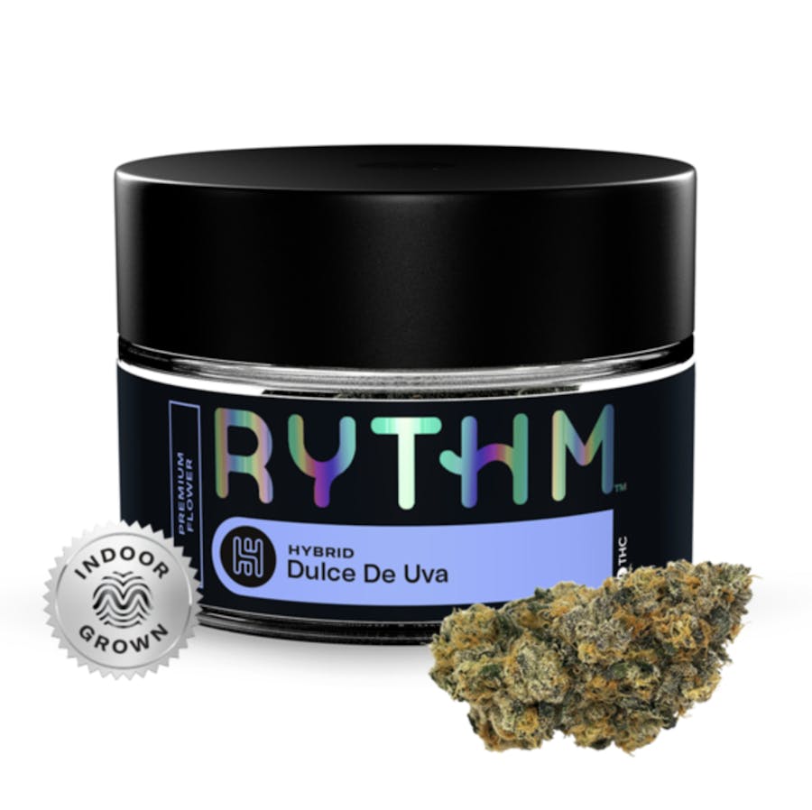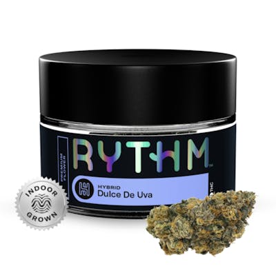 Rythm | Dulce De Uva | Premium Flower | Hybrid | 3.5g[orig. Ice Cream Cake x (Grape Pie x Wedding Crasher)] is a heady hybrid strain with resin laden buds.RYTHM Premium Flower offers a variety of expertly cultivated and meticulously cured strains with optimal potencies, lush aromas, and rich flavors.