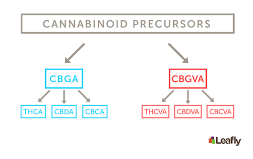 THCA and CBDA are usually the most abundant cannabinoids in strains. The others shown in Figure 1 are normally present at much lower levels. The major cannabinoid acids include CBGA, THCA, CBDA, and CBCA. CBGA is the starting compound that enzymes in the plant use to make the other three. In addition to these, there are an equal number of corresponding “V” compounds with slightly shorter chemical structures: CBGVA, THCVA, CBDVA, and CBCVA.