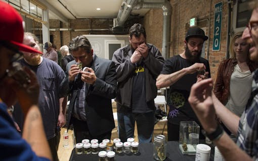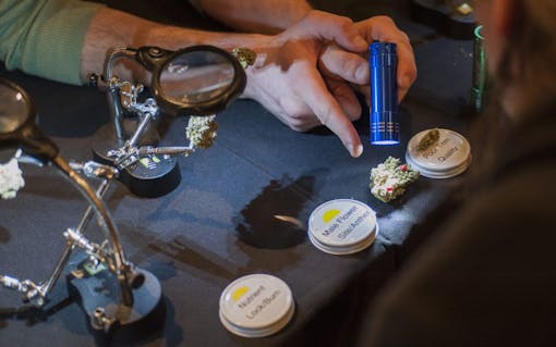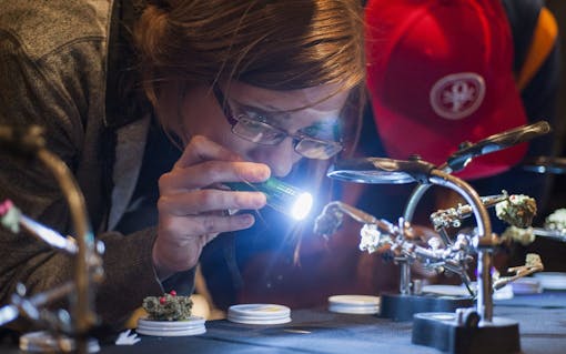 Students hunched over the table, holding lights and magnifying tools close to the specimen. Cannabis buds were lined up on wire frames, illuminated under bright lamps that exposed every detail and flaw of the flower. Across the room, curious pupils passed around jars of cannabis, inhaling with three short breaths through the nose like wine sommeliers.