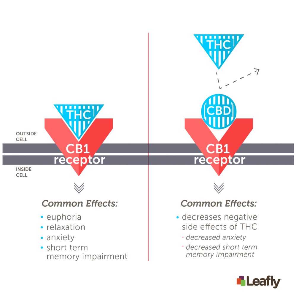 Despite being chemical cousins, THC and CBD have very different effects. The primary difference is that THC get you high while CBD does not. This is because THC and CBD affect our endocannabinoid system (ECS) in different ways. The major ECS receptor in the brain, CB1, is activated by THC but not CBD. In fact, CBD can get in the way of compounds like THC, preventing them from activating the CB1 receptor. This is why the THC:CBD ratio is so important for influencing the effects of cannabis products.