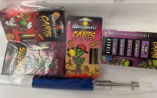 In “pen factories,” illicit market manufacturers fill thousands of these illegal carts per day with mixtures of street-grade THC oil, cutting agents, and flavorings. Distributors then wrap them in professional-looking packaging and ship them to illicit pop-up markets in California and beyond. The suspected tainted carts seized in the Hanford, CA, investigation—labeled West Coast Carts—read “80-85% THC,” “lab tested,” and “100% Dank.”