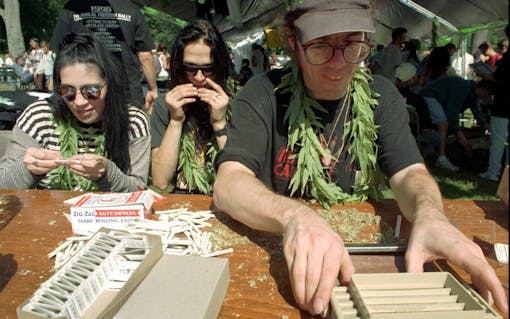 Herb cigarette vendors, including from the left, Veronika Alexander and Alyn Cornell of East Greenwich, Mass., and Jay Morgan, of Boston, roll cigarettes made from an herb they identified as mugwort Saturday, Sept. 21, 1996, at the annual Freedom Rally. Morgan explained that his group made and sold the herb cigarettes to confuse the police as to who was or was not smoking marijuana. (AP Photo/Steven Senne)