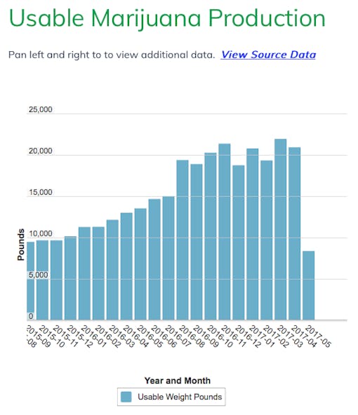 In the above chart, the spike in sales in early 2016 coincided with the increase in retail cannabis licenses. In January 2016 the state Liquor and Cannabis Board (LCB) increased the cap on retail licenses from 334 to 556. The state LCB tracks dollar-amount sales of concentrates, edibles, and topicals, but not flower. The agency does track the production of usable marijuana, which it tallies in pounds, in the chart below.