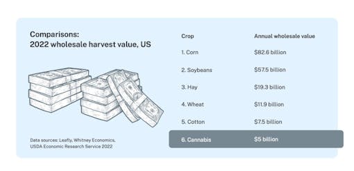 A: As a crop, adult-use cannabis is worth $5 billion in 2022 and is the sixth most valuable crop in the US—ahead of potatoes or rice.