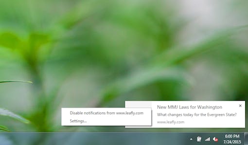 We recently enabled notifications for the latest trending news from Leafly. When you visit Leafly.com, you may notice a little drop-down in the upper left hand corner asking for permission to enable desktop notifications for Leafly on your web browser. If you click "Allow," this adds you to our list of users receiving notifications for our latest news and updates. Desktop and mobile browser notifications are provided by web and mobile browsers such as Chrome and Safari so you can get alerts from your favorite websites.