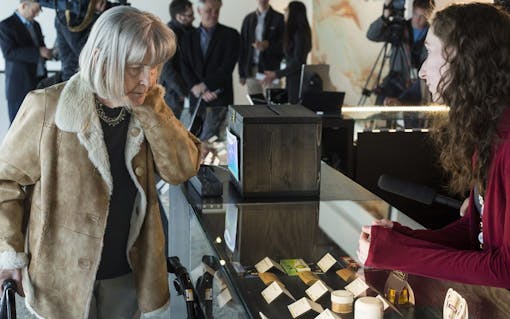 Ilene Cohn smells a pipette containing terpenes and essential oils at Vela Cannabis in Seattle, Washington on March 16, 2017. Cohn was part of a group from Sound Vista Village, an assisted living facility in Gig Harbor, that visited Vela Cannabis. (David Ryder for Leafly)