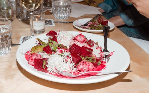 No guest could escape the CBD from the moment they entered the softly-lit and chaotic converted patio space: young bartenders, dressed in tees and jeans, served a yellowish cocktail called the Care Away—aquavit, absinthe, agave and, naturally, CBD oil—while two spry guys with matching manes of impeccably mussed hair, who turned out to be the co-founders of the CBD manufacturing company plant people, offered samples of their tincture to anyone interested. Vincent Marino, the restaurant’s French-Italian co-owner, wearing a backwards baseball hat and a thin scarf like a snake wrapped around his neck, expounded on hash with mischievous glee.