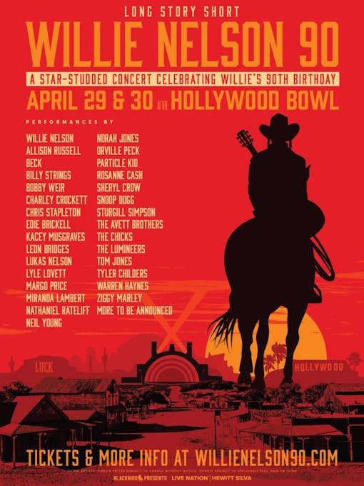 How to honor a man whose musical and cannabis legacy looms from coast to coast? Have him throw a birthday party! Willie Nelson and a gaggle of his fans, colleagues and disciples will play a two-day concert at the Hollywood Bowl on April 29 and 30, at 7 p.m. and 6:30 p.m. respectively. Featured acts include Neil Young, Snoop Dogg, Kacey Musgraves, and The Chicks, among dozens of others. Tickets are steep, and start at $460. (2301 N Highland Ave, Los Angeles, CA 90068)