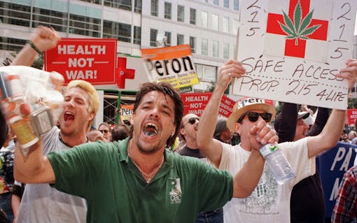 Babaji Zeiger, center, holds a bag in his right hand contaning his prescription medicine he takes for AIDS at a rally opposing a federal lawsuit which seeks to close clubs that distribute marijuana for medical use in front of the Federal Building in San Francisco, Tuesday, March 24, 1998. Zeiger said he smokes marijuana to help him cope with pain and nasuea from AIDS. (AP Photo/Thor Swift)