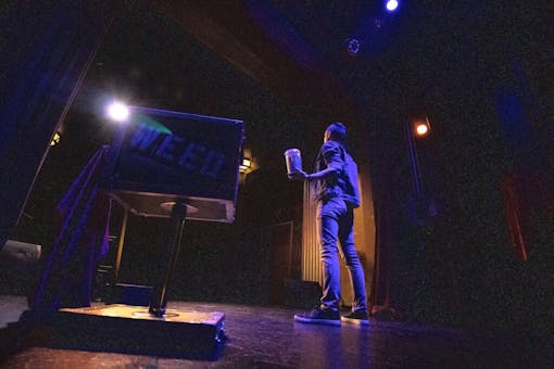 Once inside, the stage seemed appropriately set. There was a bong on stage, crates decked out with 4/20 slang, and colorful lighting. Then Ben Zabin took the stage. For 70 minutes, the audience was at his mercy.