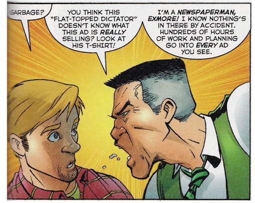 Later, when Exmore finally meets Whelan, Exmore is let down by the actor’s facade. Sam is upset that during Whelan’s music video shoot (the entire comic leads you to believe Whelan is a movie star, only to lead up to him shooting a music video for Fastlane, not an actual movie titled Fastlane) Whelan isn’t doing his own stunt work. This angers Exmore, who now believes his Hollywood hero is a fake.