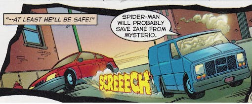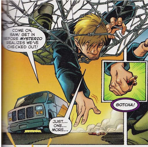 Readers are led to believe that smoking weed caused this over-the-top act. Almost immediately, Exmore gets back into the van and is hit by a truck that explodes, causing Sam to almost fall to his death before Spidey, and—comically—most of the Marvel Universe’s heroes, saves the day.