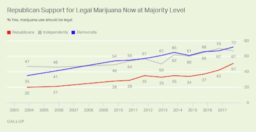 Another fascinating find by Gallup: The growing support of cannabis legalization among the GOP, with 51% of respondents who identify themselves as Republicans now expressing support for legalizing cannabis, up nine percentage points from 2016.