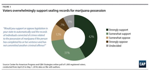 In terms of cannabis possession specifically, an even greater number (77%) of respondents said they favor automatically sealing criminal records. Notably, 54% of those who said they oppose cannabis legalization nevertheless support clean slate policies.