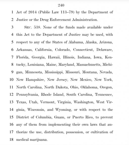 The full text of the medical marijuana amendment, as it stands in the current spending bill, appears below.