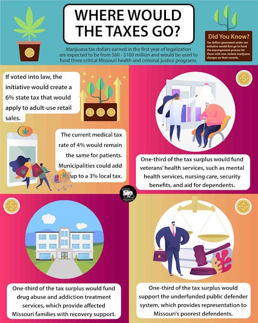 Adult-use marijuana sales would be taxed at 6% under the Missouri measure. The tax is estimated to bring in more than $46 million during the first full year the amendment is in effect and close to $70 million the following year.