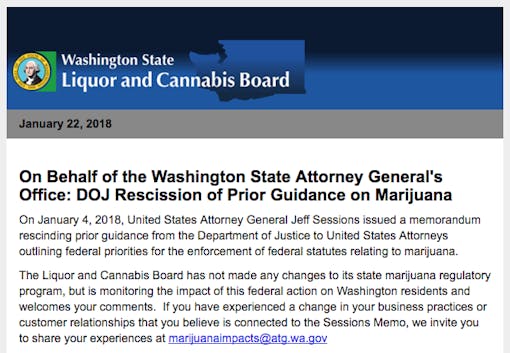 “If you have experienced a change in your business practices or customer relationships that you believe is connected to the Sessions Memo,” the bulletin says, “we invite you to share your experiences.” It refers respondents to a dedicated email address at the AG’s office: marijuanaimpacts@atg.wa.gov.