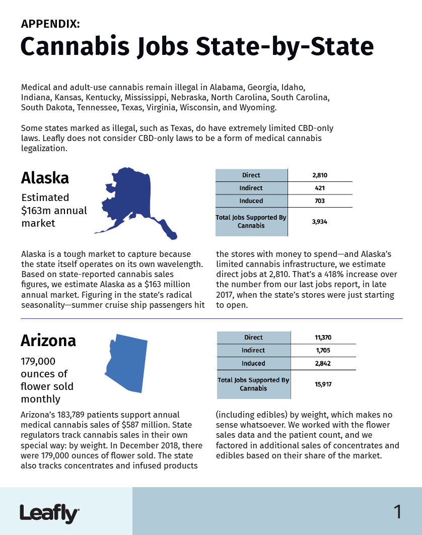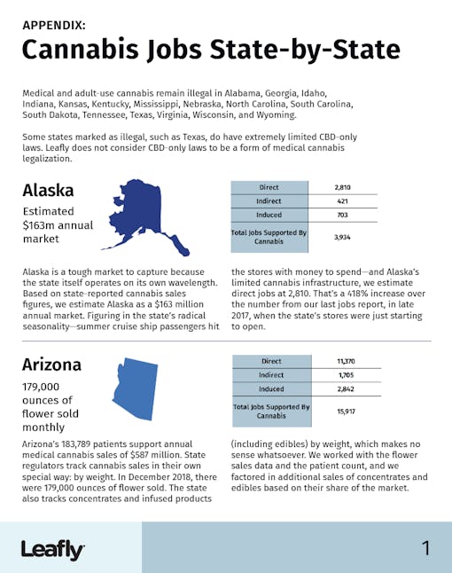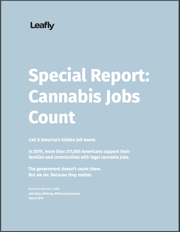 Special Report: 2019 Cannabis Jobs Count is available only at Leafly. The main report offers a national overview of direct employment as well as indirect positions and jobs induced by the legal cannabis industry. We also offer data about tax revenue in legal states, growth predictions for 2019, salary ranges for the most in-demand cannabis jobs, and tips on getting hired. The report’s appendix offers a state-by-state analysis of market size, growth, and job numbers.