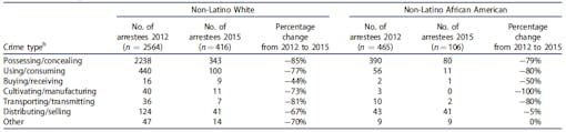 Note the enormous percentage drops for both white people and black people in nearly all categories. Arrests for possession, consumption, illegal purchase, cultivation, and transportation fell 44% to 100% for both racial demographics, and at similar levels. In other words, possession arrests fell 85% for whites, and 79% for blacks. Consumption arrests fell 77% for whites, and 80% for blacks.