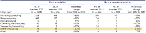 The clear outlier is the data on illegal sales. Arrests of white people fell from 124 in 2012 to 41 in 2015, a drop of 67%. But arrests of black people remained nearly unchanged. 43 people were arrested in 2012, and 41 in 2015. That’s a drop of only 5%.