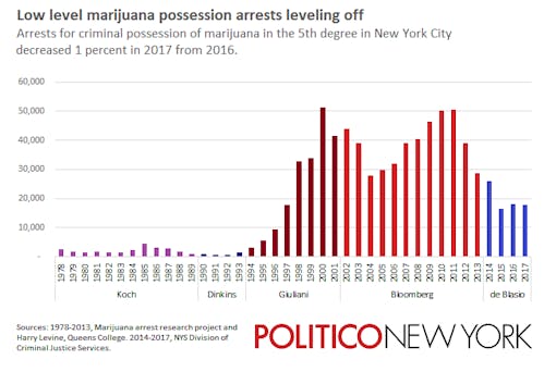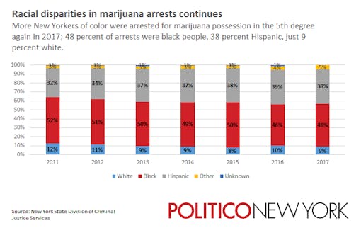 Under Mayor Bill de Blasio, 85% of the people arrested for cannabis offenses were people of color. Under Michael Bloomberg, that figure was 84%.