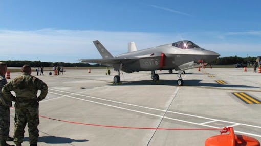 An F-35 fighter jet arrives at the Vermont Air National Guard base in South Burlington, Vt. on Sept. 19, 2019. (Wilson Ring / Associated Press)